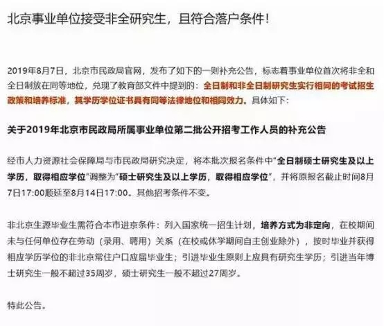 其實(shí),早在8月份,北京民政局所屬事業(yè)單位第二批公開(kāi)招考工作人員的補(bǔ)充公告就已經(jīng)承認(rèn)了非全日制研究生的含金量,公告指出非全日制研究生不僅是招聘對(duì)象,還可以享受落戶北京的政策。